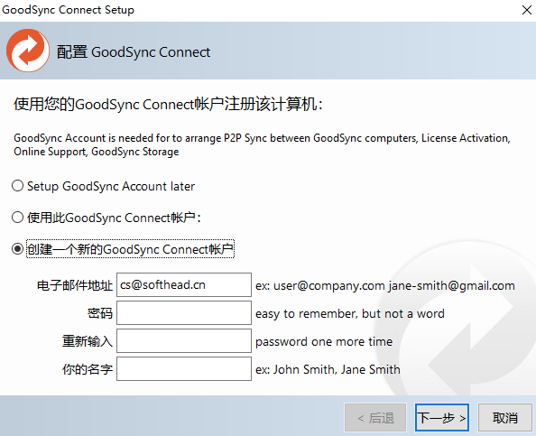 2)然后选择创建一个新的 GoodSync Connect 帐号,填写相关信息进行注册新的帐号。如果您有已经注册了帐号,您在这里直接登录就行了。
