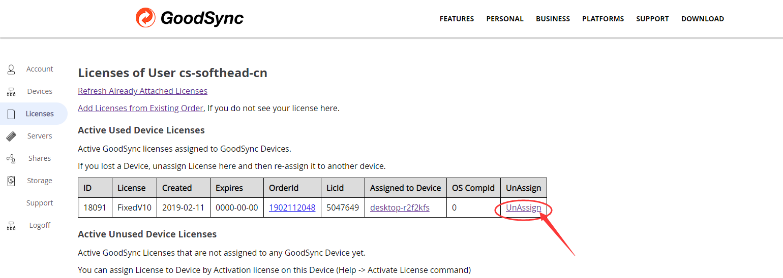 我们可以登录 Goodsync 帐号,通过帐号可以看到激活的设备,然后如果需要在新的设备上激活,就可以停用当前设备,停用之后就可以在新的电脑上登录帐号激活了。