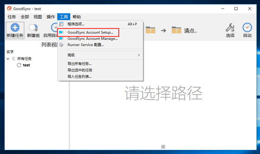 1)打开 GoodSync 软件,点击 工具 菜单,然后点击 GoodSync Account Setup…